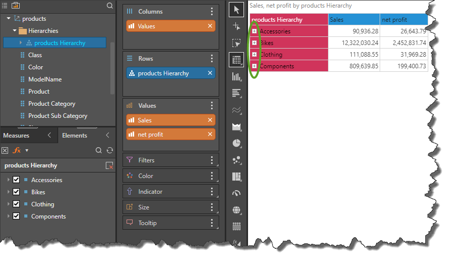 A regular hierarchy added to a grid visual will display expand and collapse buttons; these are used to exposed different levels of the hierarchy within the same column.