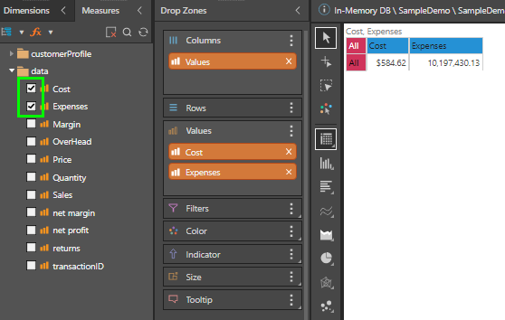 Simply select the checkbox of the measures you want to add to the query. Pyramid will add the selected measures to the drop zones automatically.