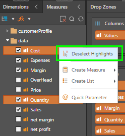 Remove multiple measures from the query at once Shift or Ctrl + selecting (click on the measure caption, NOT the measure checkbox); the selected measures will be highlighted orange. Right click on one of the highlighted measures and click Deselect Highlights.