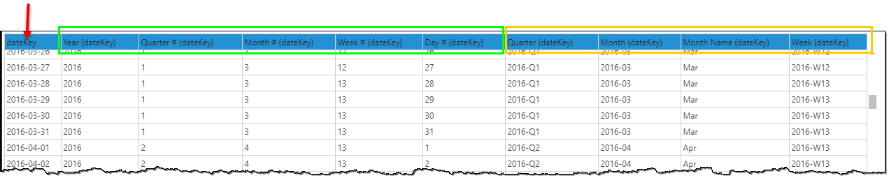 The grid below, which shows all the different date part fields based on the first raw data column "dateKey" - which does not have any time elements.