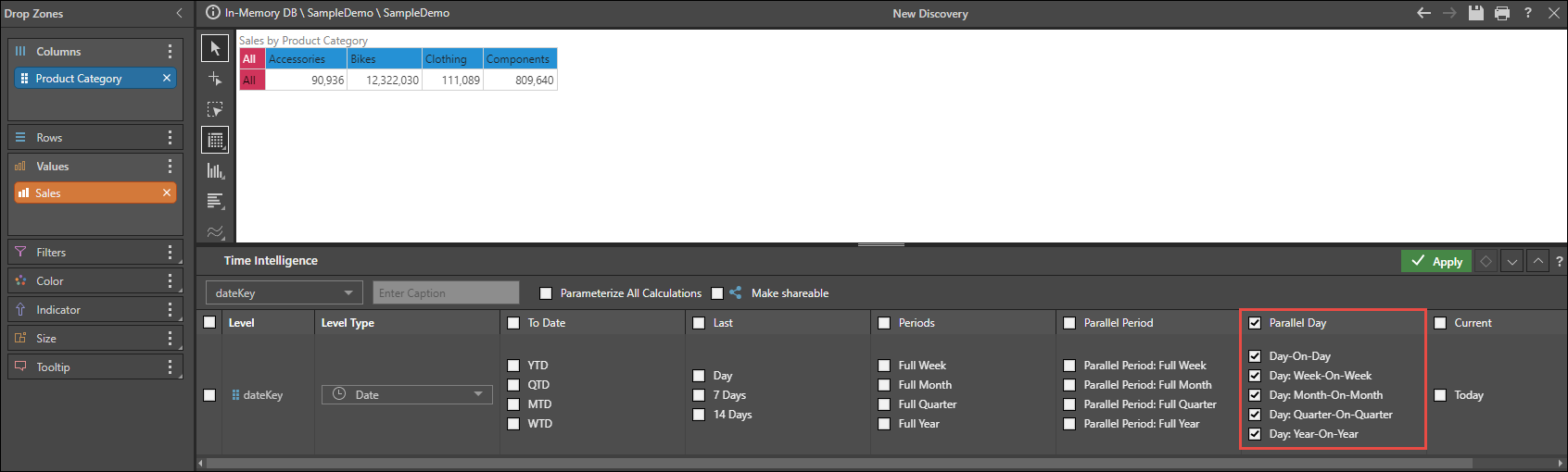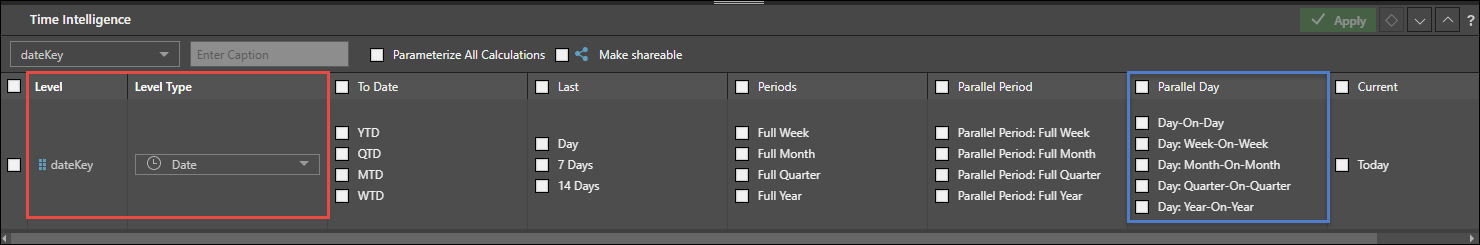 In this example, all Parallel Day functions red highlight) are applied from the Time Intelligence wizard:
