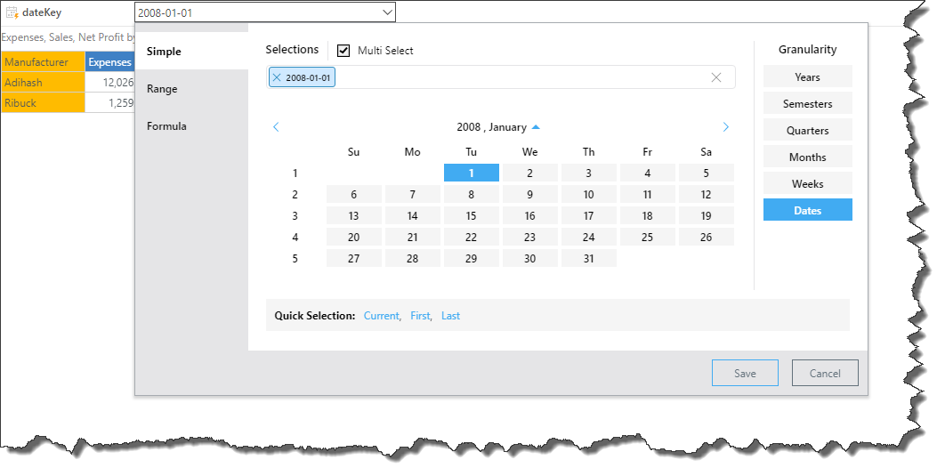 Pyramid offers 2 ways solutions for this requirement: on-the-fly date part calculations, and calendar slicers. While date part calculations produce custom columns which can be added to any part of the query, the calendar slicer is used to filter the query by specified dates or time periods, date ranges, and date formulations. From the calendar slicer, the user selects the required date(s) or time period and the query is filtered on-the-fly, without creating custom columns.