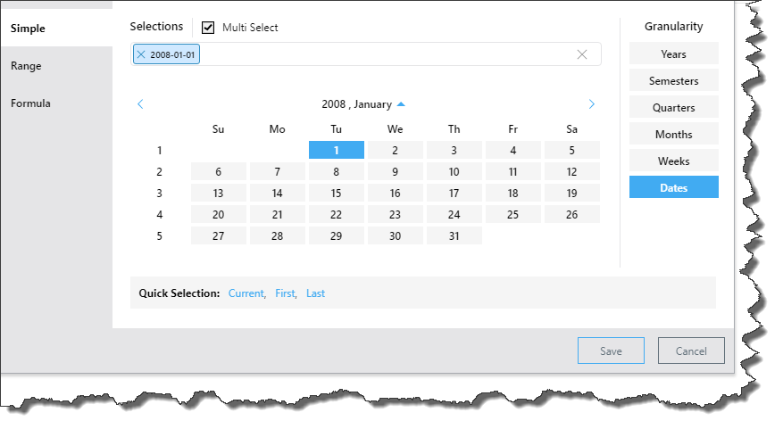 Current: depending on the given level of granularity, selects today's date (if it exists in the system) or the current year, semester, quarter, month, or week. If the current date/ time period doesn't exist in the system, the last date/ time period will be selected instead.