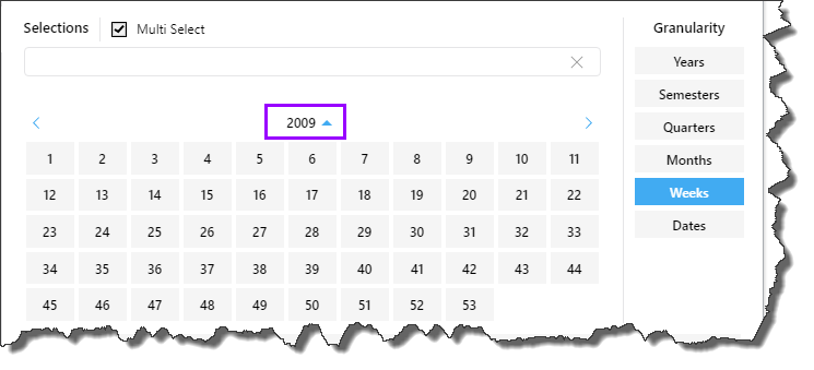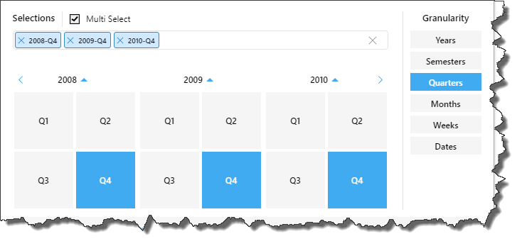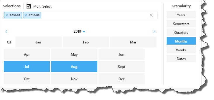 Rather than displaying dates only, the calendar picker allows you to specify the desired level of granularity, meaning you can choose to display any of the date time groupings in the calendar and make your selections accordingly.