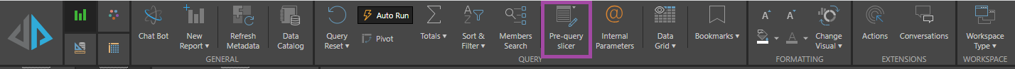 When pre-query slicers are enabled in the query, the Pre-query Slicer button appears in the Report ribbon (purple highlight below):
