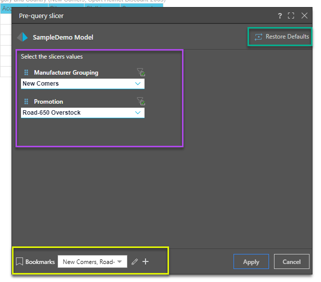 - Next time you open the Pre-query Slicers dialog, your bookmark will appear in the Bookmarks drop down list. Select the required bookmark and click "Apply" to load the query.