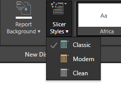 Slicers are used to filter queries using hierarchy elements from the data model. The Slicer Styles drop-down is used to change the design style of the slicers. The drop-down includes three styling presets: Classic, Modern, and Clean. The selected style is applied to all slicers in the report.