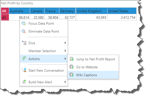After the action is configured, it appears under Actions when the context menu is opened from a data cell: