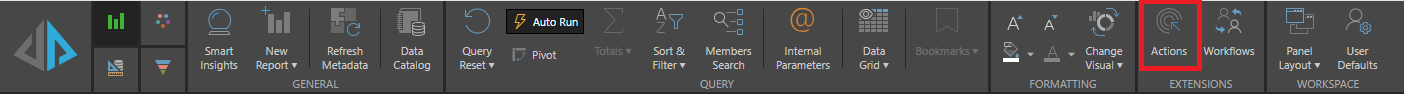 Actions are a convenient and effective means of extending the classic flow of analytics. Use the Actions panel to configure specified actions that will be triggered when a user clicks somewhere on the visual. To learn about using Actions in Present, click here. To learn about support for MS SSAS defined Actions, see Cube Actions.
