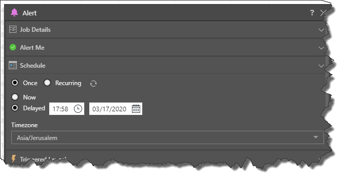 - Configuration of triggered launches; in this scenario, the alert job only runs when the given trigger(s) is met.