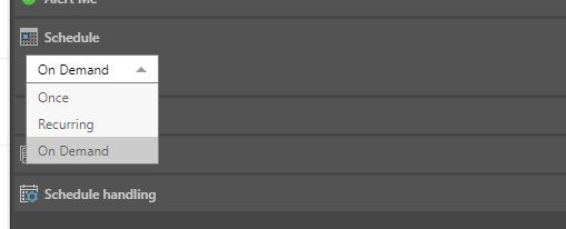 On Demand Schedules are used to trigger the rendering of specified publications, alerts, and subscriptions when the underlying data model is reprocessed, or via an API call.