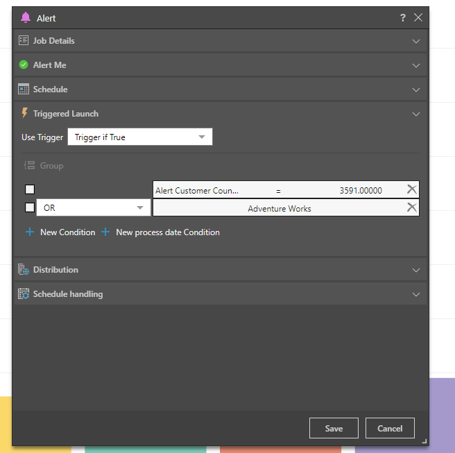 You can also configure a model-refresh condition to trigger the alert when the underlying data model is refreshed.