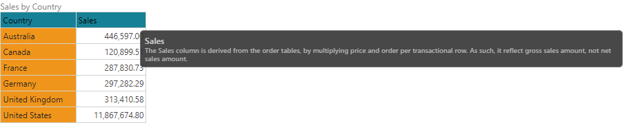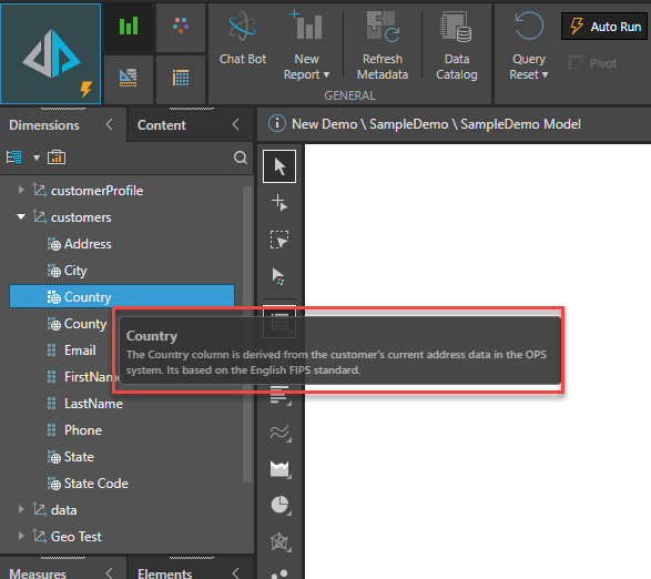 As a user hovers over hierarchies in the hierarchy tree, measures in the measure tree or items in visualizations, they will be able to see snippets of the data catalog in pop-up tooltips.
