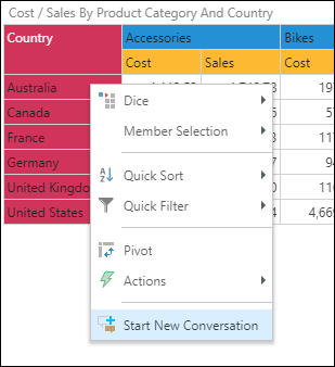 To comment on a data point, start a cell level conversation. This allows you comment on a specific data point in the query, such as Australia & Bikes & Cost. To do this, right click on the required cell in the query, and select Start New Conversation from the context menu.