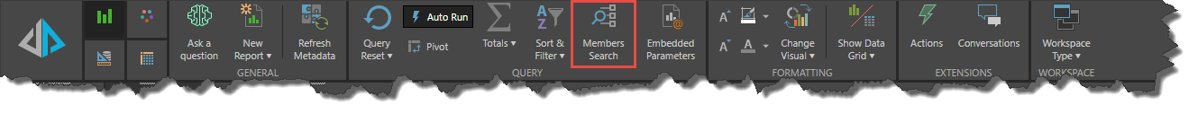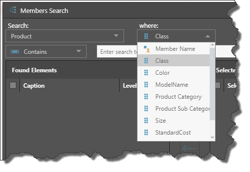 The members search functionality provides a convenient way for users to find the member elements they need, and add them to the query.