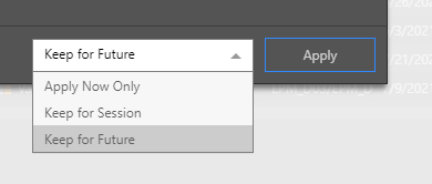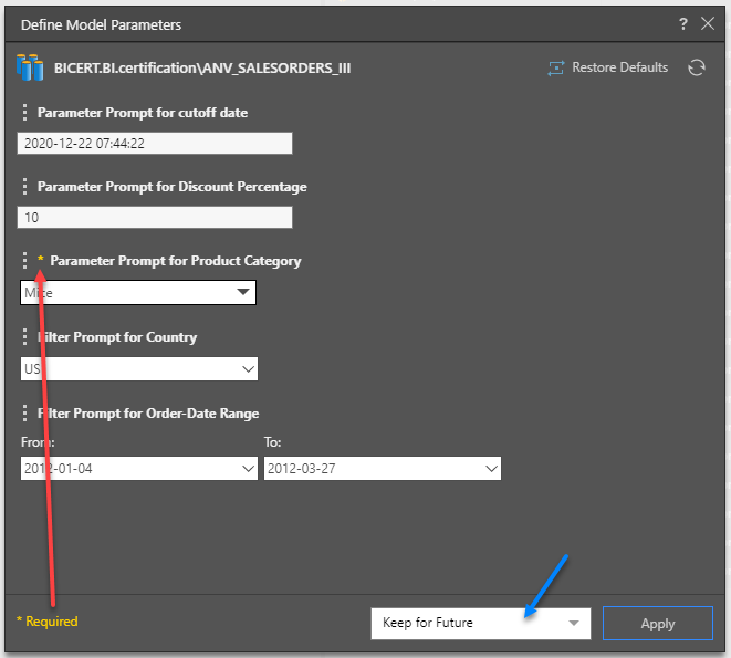 - Keep for Future: your selections will be saved and will always appear in the parameters dialog whenever the report or model is opened.