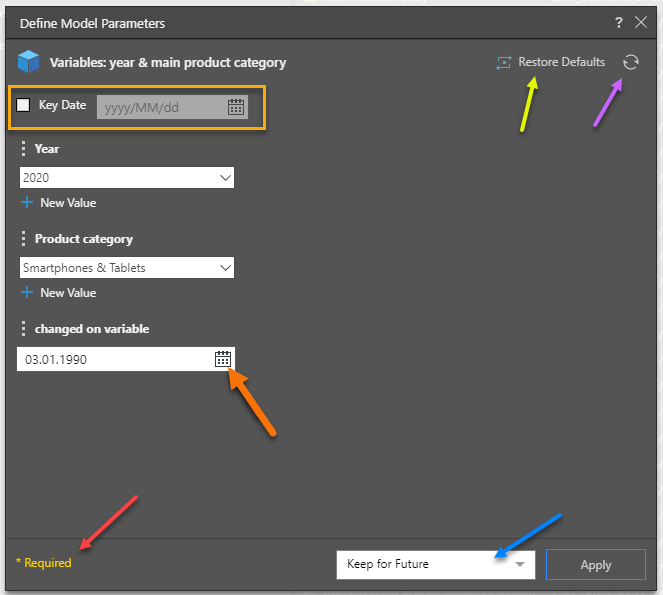 When a data model that contains parameter configurations is opened (from any relevant app), the Model Parameter dialog (as shown below) is automatically presented to users.
