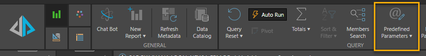 This dialog can also be subsequently opened by clicking Predefined Parameters from the Report ribbon in Discover afterward to change any settings made (yellow box below).