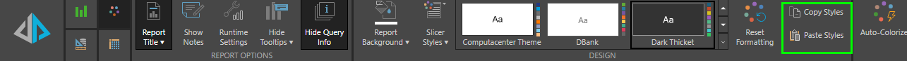 The screen capture below shows the process of copying styles from one report, and then applying them to another report: