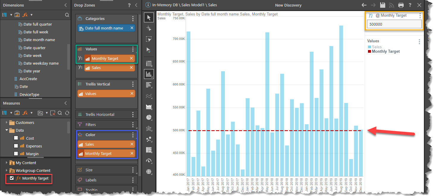 The Custom Reference Line will be automatically added to the value drop zone (green box) and to the color drop zone (blue box)