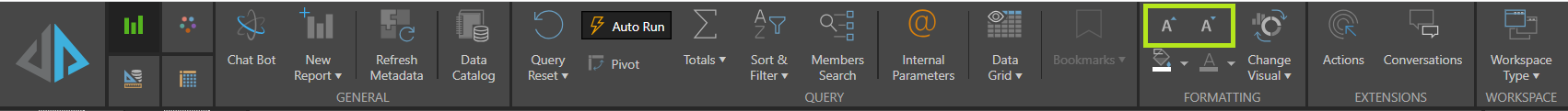 To change the font size, toggle the font size icons (green highlight below) from the Report ribbon.
