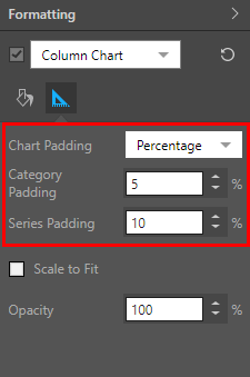 Adjust chart padding for Cartesian charts from the Formatting panel, by opening the Settings tab below the chart drop-down (ensuring that the chart itself is selected).
