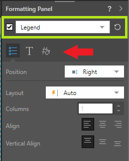 - Depending on the selected component, there are multiple tabs (red arrow) of formatting options, with each tab addressing different formatting needs for the selected item. For example, when a legend is selected, there are tabs for general settings, the legend's title, and so on.