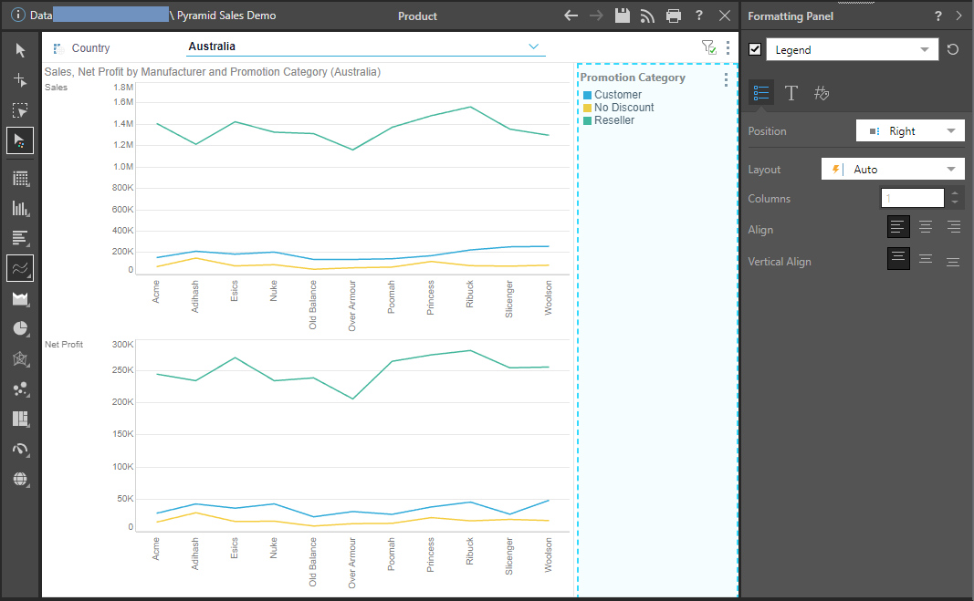 - The panel includes a Component drop-down (green), where you can select different components that you would like to format, like Report Title, Data Labels, Legend, and more.