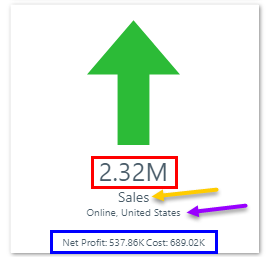 - KPI Name: This is the label directly underneath the value (orange arrow below). If the gauge was built on the fly in the Discover, the default name will be the labels of the measure(s) in the Values drop zone, the measure in the Status drop zone, and the member element(s) from the given hierarchy or hierarchies. If the gauge is based on a custom KPI built in Formulate, the KPI Name will be the name that the KPI was saved as.