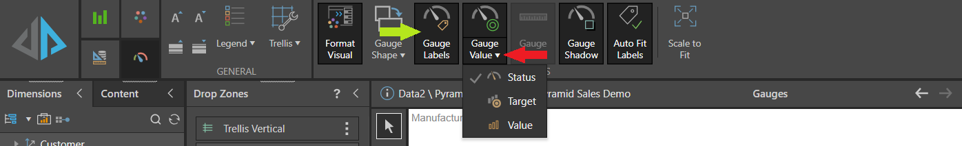 The Gauge Labels button (green arrow below) and the Gauge Value button (red arrow) are shown on the ribbon when working with gauges: