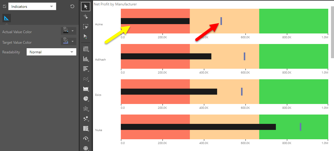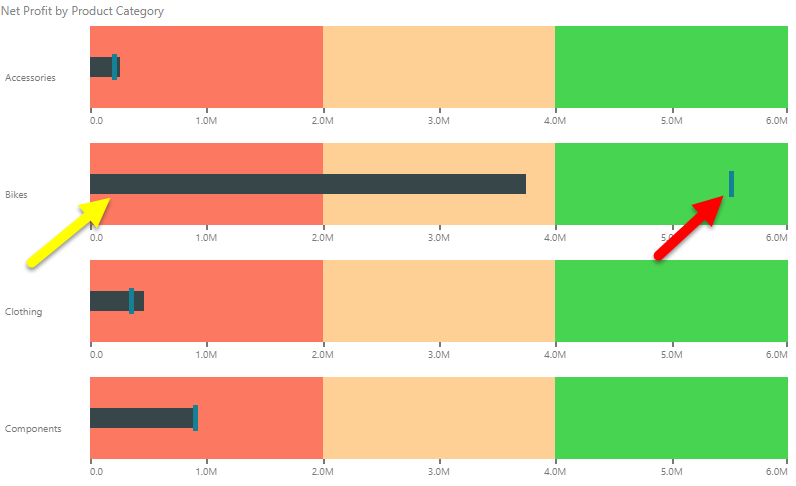 The bullet chart features 2 indicators that display the actual value and the target value. The actual value is represented by the bar (yellow arrow below), while the target value is represented by the vertical line (red highlight below).
