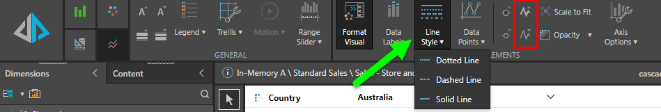 When customizing lines, you can apply changes to all lines in the visual, or to a given series only (series editing). To apply changes to all lines, choose default from the Channel drop-down (green highlight below).