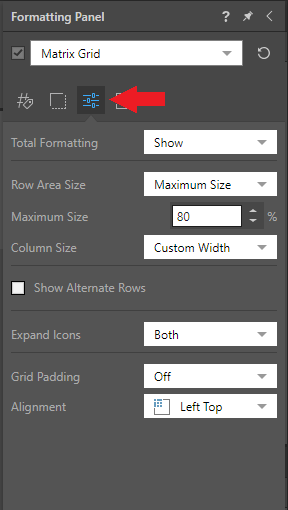 When working with Matrix Grids, you can edit the overall design of the grid by selecting Matrix Grid from the drop-down in the Formatting Panel. You can also edit formatting for other components of the grid (like data, rows and columns, and report title) by choosing the relevant option from the drop-down menu.