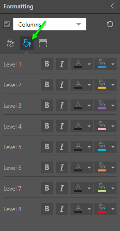 Column levels are counted from top to bottom, so that top-most column hierarchy is Level 1, the second is Level 2, and so on. By default, the level background (fill color) and foreground (font color) are determined by the given theme. However, the Fill tab supports changes in the current grid for up to 8 column levels.