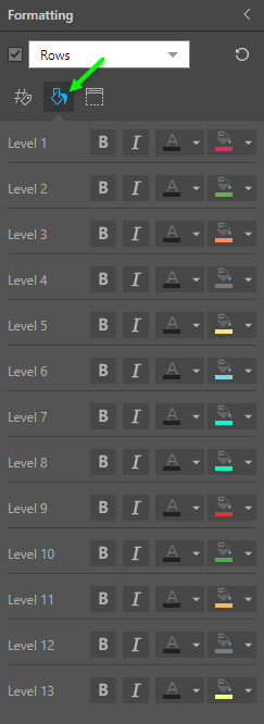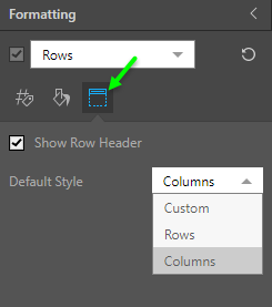 Formatting for Column and Row headers can be adjusted to change the font, fill color, and more. The Rows and Columns views of the Formatting panel expose various formatting functions that enable users to customize formatting of grid rows and grid columns respectively. From the Rows or Columns window, font type, size, color, emphasis, and alignment may be changed. From the Rows Level or Columns Level window, background color and foreground color and emphasis may be changed by level or by selection.