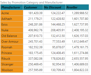 Matrix grids display a row header by default, showing the name of the hierarchy in the rows. The options for displaying and customizing the row header are the same as those described above for the column header.