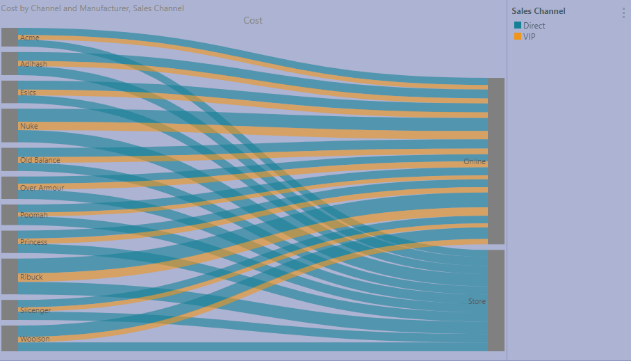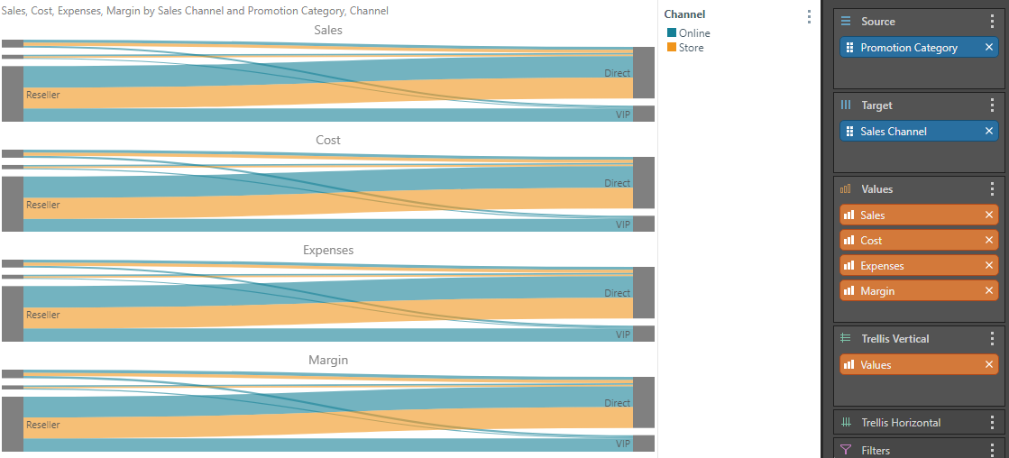 In this example, the Sankey chart was trellised using 4 measures. It was then scaled down to fit the canvas.
