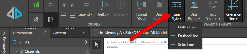 In the image below, the default solid line style is applied to all series members except 2; a dashed line was applied to the Poomah series (pink arrow) and a dotted line to the Acme series (blue arrow).
