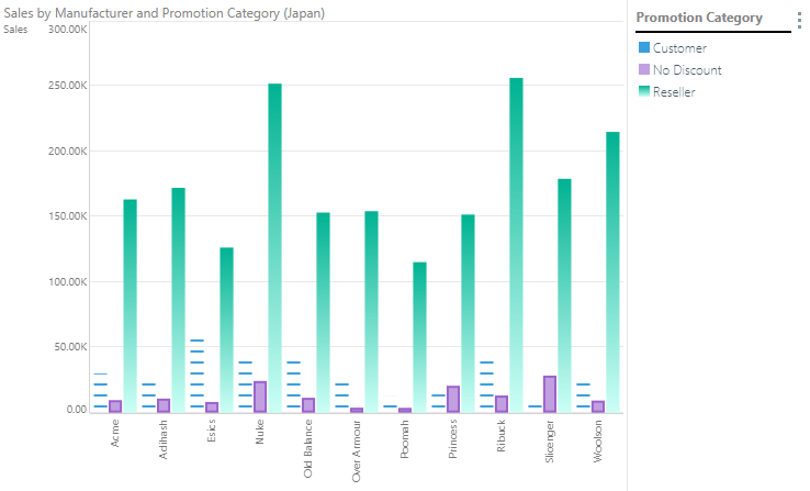 In this example, the color was changed for each series. The Customer series' fill was then changed to the horizontal stripes pattern; a border was added to the No Discount series; and the Reseller series' fill was changed to a gradient.