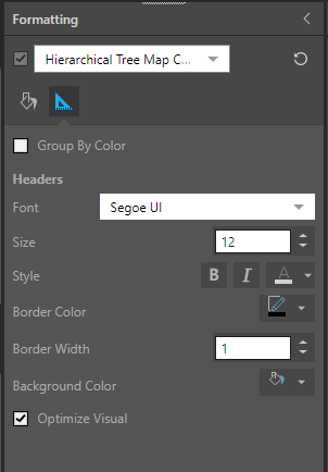 When working with Tree Maps and Hierarchical Tree Maps, you can change the background color from the Formatting panel. You can also adjust the headers for Hierarchical Tree Maps.