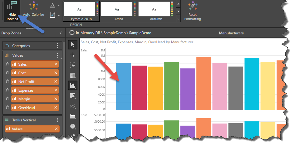 Here, tooltips are disabled (blue arrow); no tooltip is displayed when hovering over a data point (red arrow).