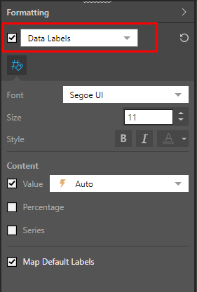 From the Formatting panel, you can change the font type, size, and style for the data labels, and you can adjust the content of the labels.