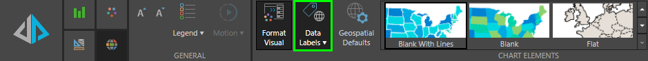 To adjust map labels from the Component ribbon, go to the Data Labels button; toggle the button to show or hide the labels, or open its drop-down for more options.