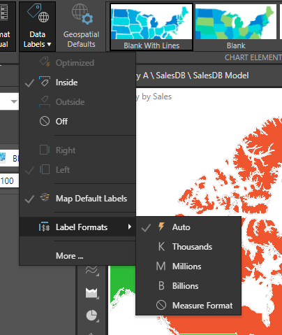 When working with shape maps, the Data Labels feature will be exposed in Component ribbon. By default, it is enabled to show values in the map; you can opt to show percentages and/ or captions, or disable data labels. You can also change the formatting for value labels, and customize label font. These functions help you to customize the look and feel of the map, by controlling what kind of labels appear, and how they look.
