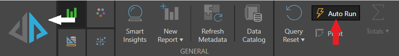 The Auto Run button is present on both the Report and Query ribbons in Discover Pro: