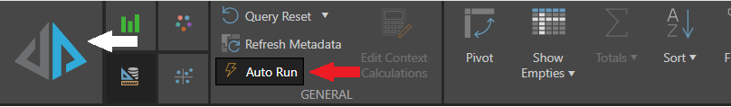 By default, most users have their queries auto run and execute based on each change they make in the interface as they click, drag-and-drop, and so on. In some situations, however, this behavior is not preferred, and the auto run option is disabled and switched to manual execution mode. This may be because the user wants to make several changes before the query executes or because the data source is slow and it's quicker to setup the selections in multiple steps before launching the query. This default behavior can be changed in the user defaults.