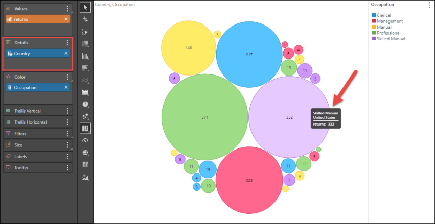 Add the Returns measure to Values. Now you have a basic circle packing chart showing the number of returns by occupation; it's easy to see at a glance which occupations accounted for the most and least returns.