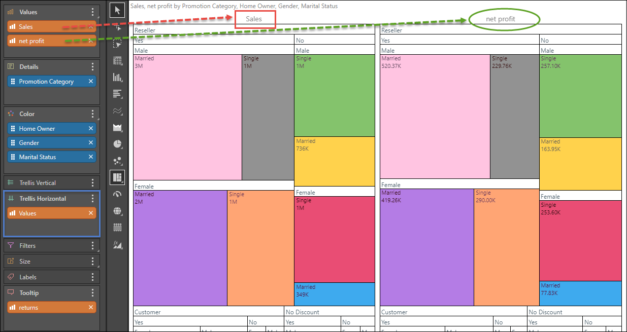 Add the Net Profit measure to Trellis Horizontal to compare sales with net profit in 2 separate charts.