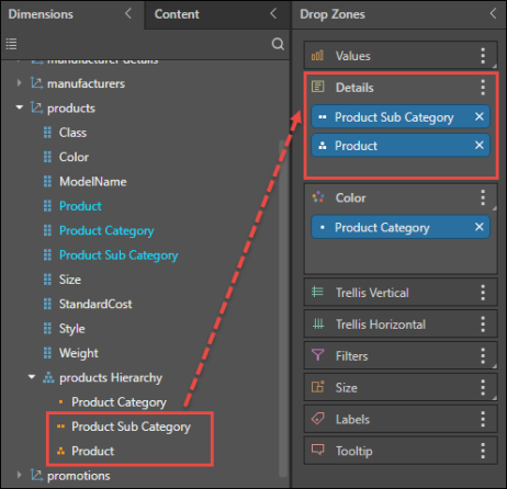 From the Products Hierarchy, add the Product Sub Category and Product levels to the Details drop zone.