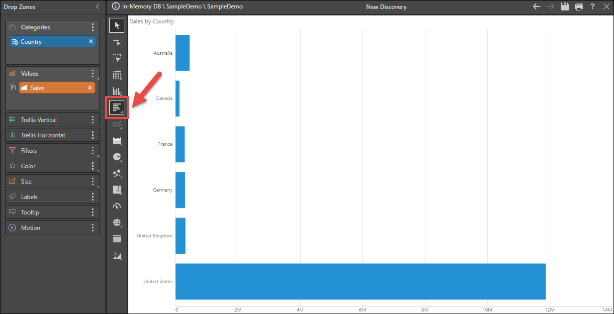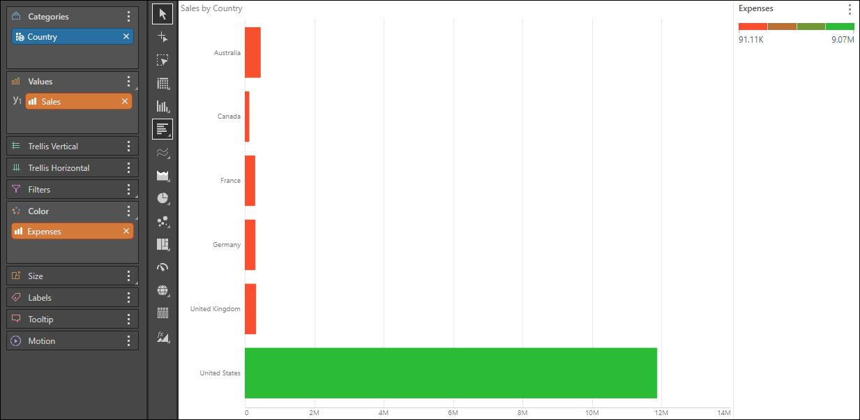 Bar charts sort the given hierarchies and measures into bars. The hierarchy added to the Categories zone will be represented on the y-axis, and the measure in the Values zone will be on the x-axis. Like column charts, bar charts must contain at least 1 member hierarchy and 1 measure. Member hierarchies can be added to the Categories or Color drop zones, and measures to the values zone.